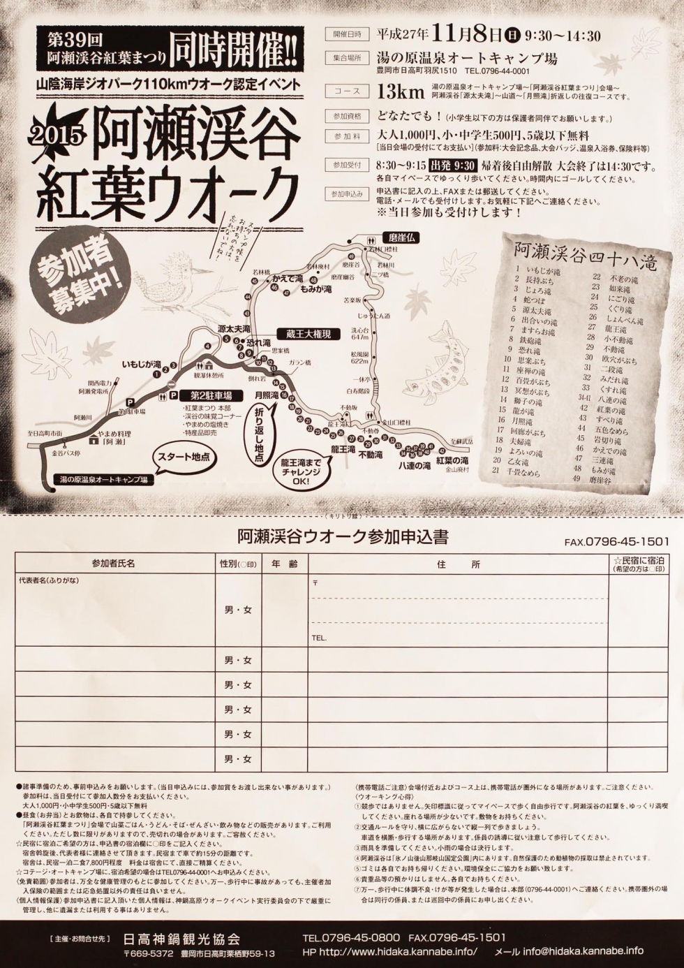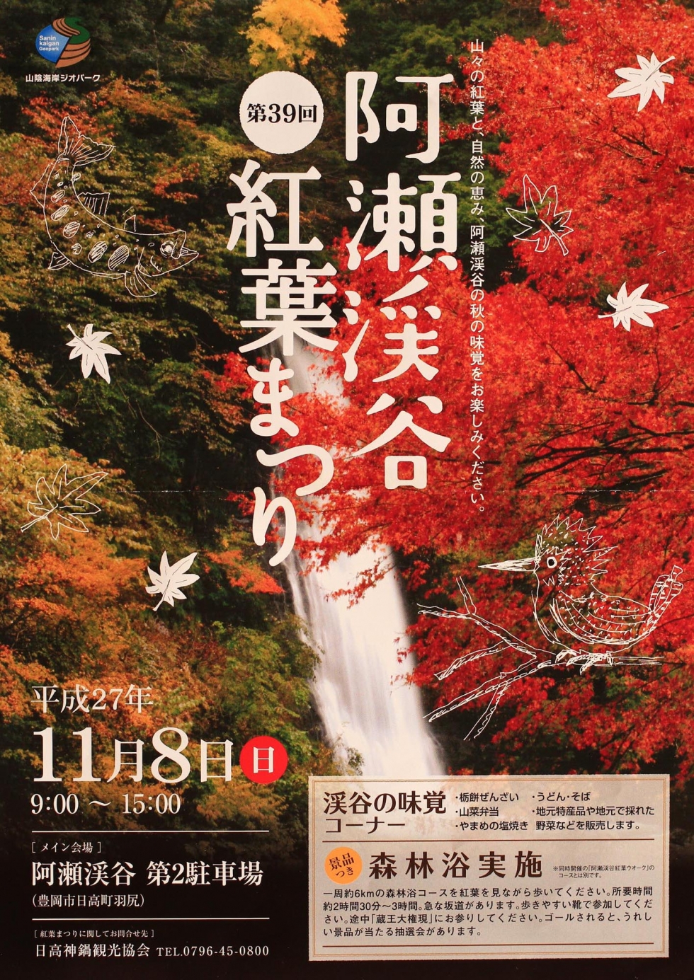 阿瀬渓谷にて「第39回 阿瀬渓谷紅葉祭り」「2015 阿瀬渓谷紅葉ウオーク」が開催されます。