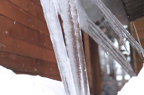 ツララ 寒いからね〜 巨大化してます なんか牙みたいになってますよ 今日は雪は降らないつもりだったのに そんなに積もる程ではないけどね 屋根に積もった雪 寒さで屋根の上で固まり30〜40センチ積もって それが気温が緩むと一気に落ちます 大量に落ちるものだから屋根の下に居ると 怪我をしかねません 今日 殆どが落ちました 除雪が大変 |